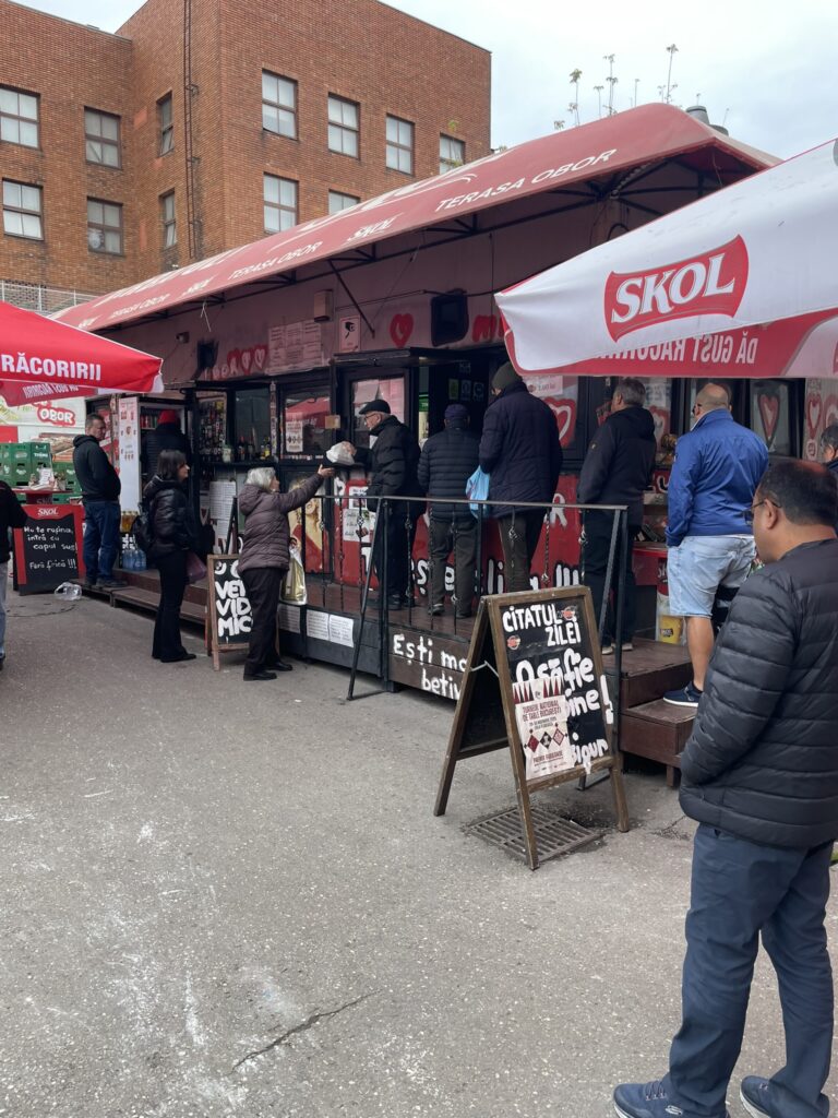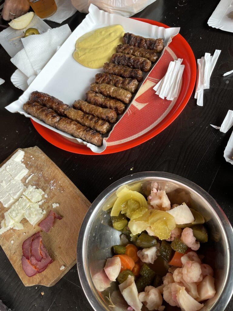 My first tour started at 10am the next day, a Tuesday. It was a five hour tour to explore neighborhoods and food. It was a great way to learn about Romanian history, especially Communist times and the chaos of the transition. We had seven people in our group-me, four women from the UK, and a Californian originally from Chile. It was a fun group to spend the day with. We had several stops for food and drinks, and even hopped on a tram a couple of times to get to places. A food fact from my tour guide was that the national vegetable of Romania is pork! One of our stops was at a place where they serve the best mici (sausages that are the national dish) in town, basically a dive but it actually won a Michelin star a few years back. So that we had more than just meat and bread, we had stopped just before at a large local market where all the fruit and vegetables were from Romania (the fresh raspberries were bursting with flavor), along with local cheeses, dried meats, pickled vegetables, etc. We added some local beer, and a shot of tuică afterward, and it was a feast!